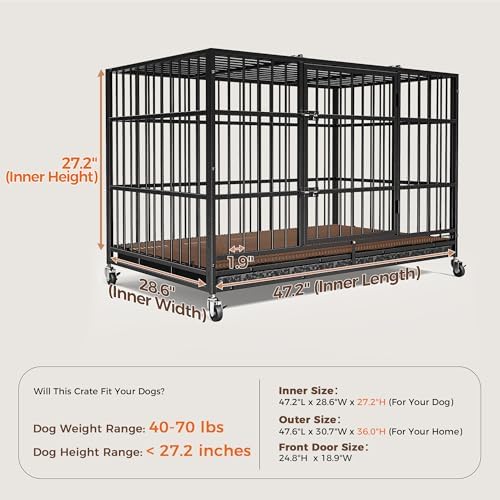 [Select the Right Size] With INNER dimensions of 47.2″L x 28.6″W x 27.2″H, this crate fits dogs weighing 40-70 lbs. The OUTER dimensions are 47.6″L x 30.7″W x 36″H, helping you find a suitable location for the crate at home