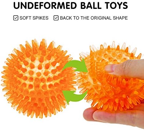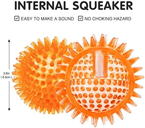 SQUEAKY BALLS FOR DOGS: Feature a internal squeaker, hidden deeply, that means dogs are hardly to squeeze it out, no choking hazard when chewing or playing. No matter how your dog bites, spiky balls will continue to make a cute sound, not too loud, but still get dogs’ attention